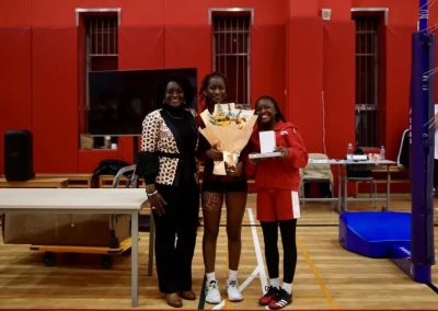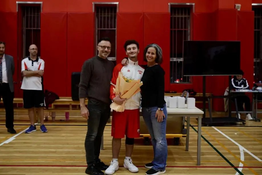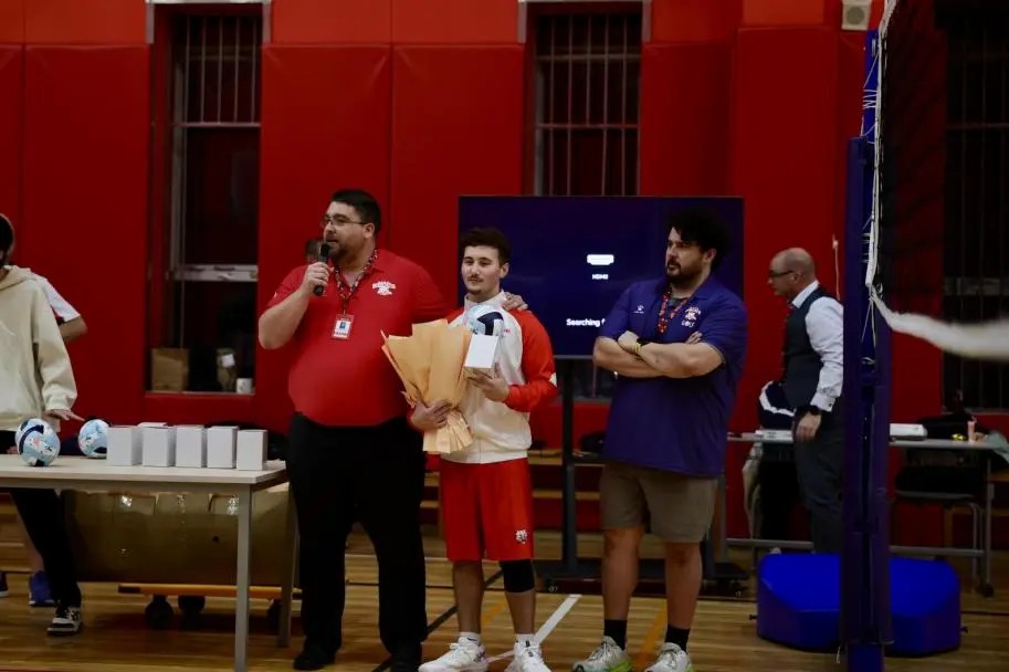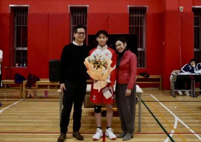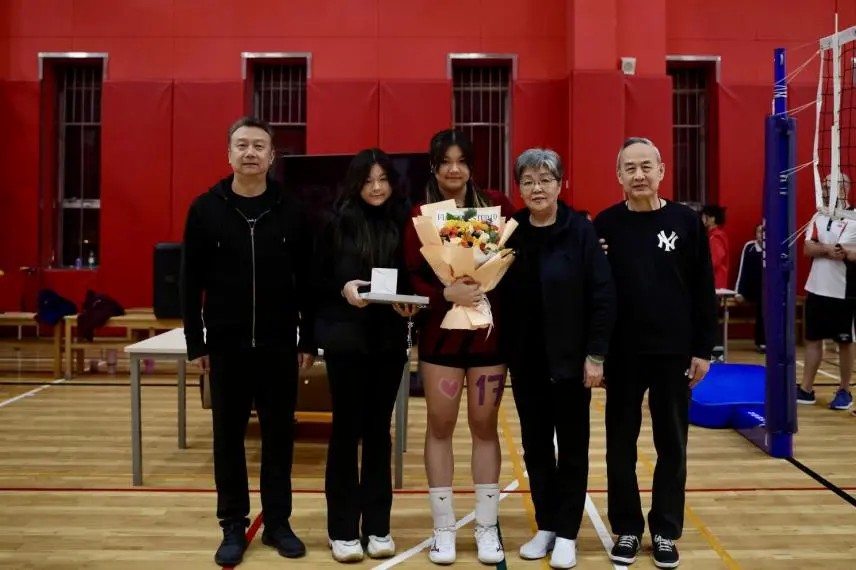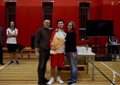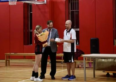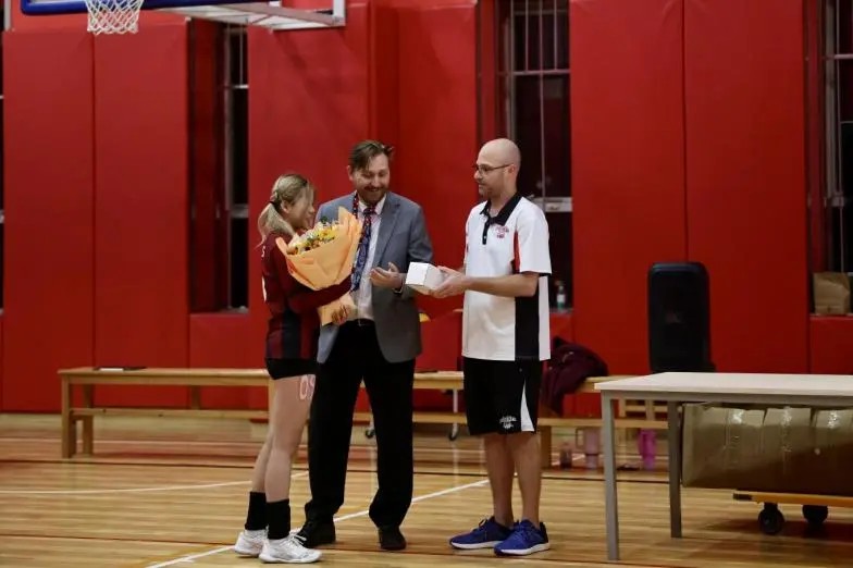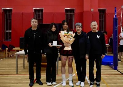 Coach Manderville and Coach Bergh then honored each of the seniors with some kind words about their contribution to the program, and all of the seniors were presented flowers and a small gift. Finally, each senior took a photo with family members who were there to support them. Truly a whole-school community celebration!