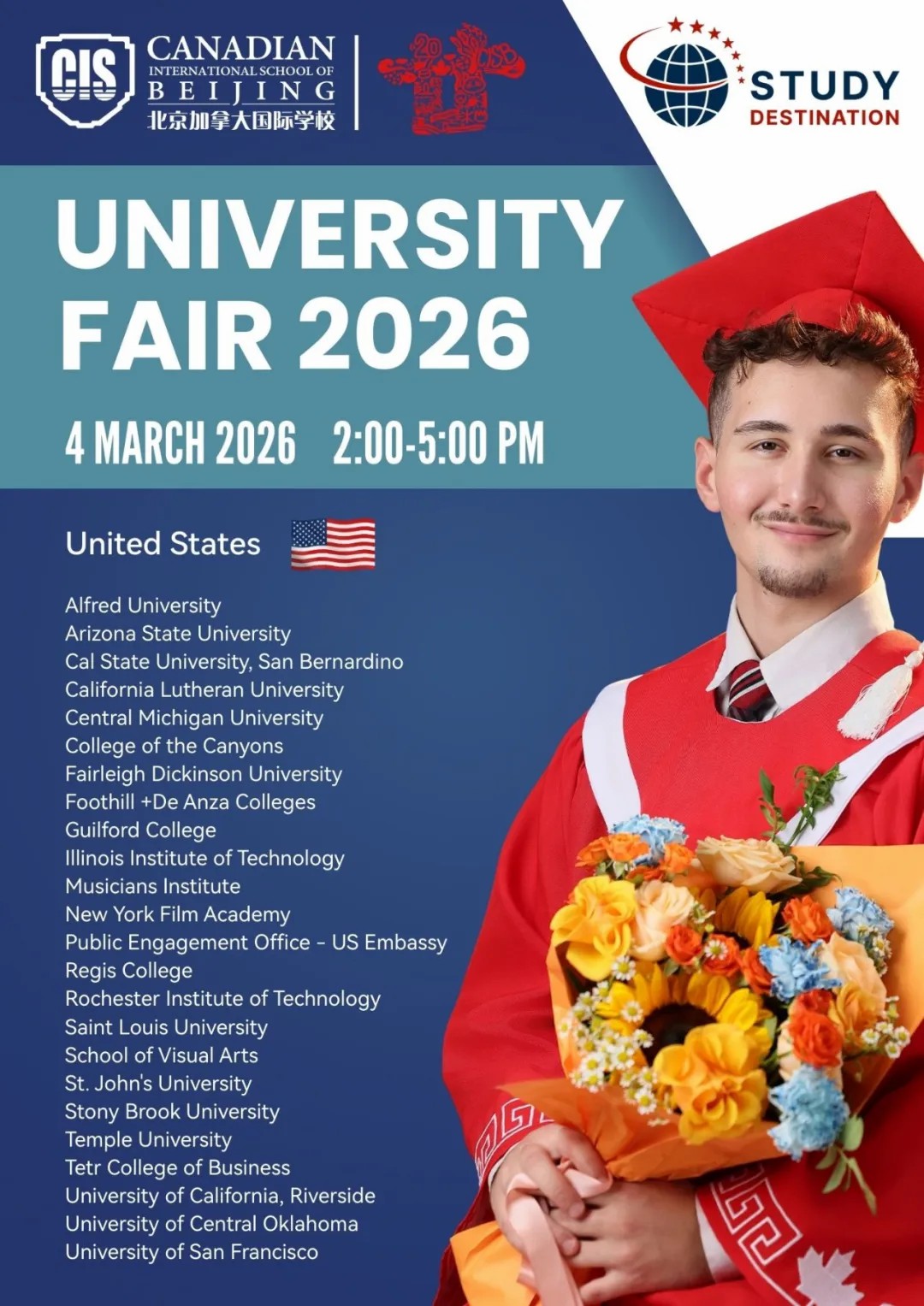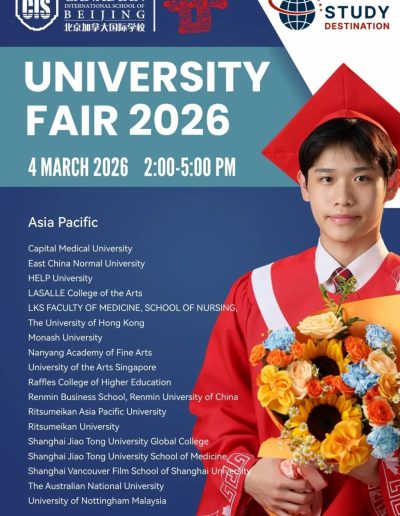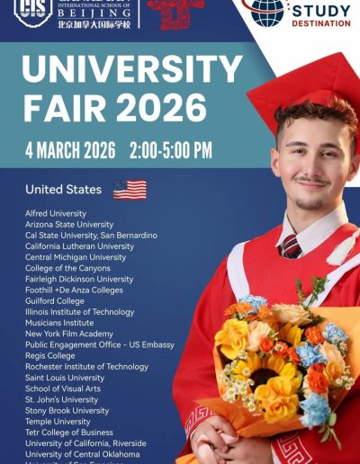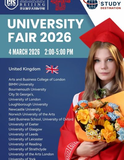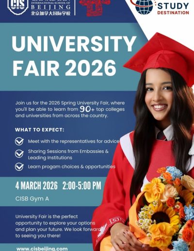 CISB x Study Destination University Fair 2026 Feb 10, 2026 | News See you in March — we look forward to hosting you! ← Celebrating Diversity and Embracing Identity CISB Appoints New Early Years & Elementary School Principal Effective August 2026, Academic Year 2026-27 → Follow us on WeChat ICP License No. 京ICP备2022029416号-1 京公网安备 11010502051829号 FollowFollowFollowFollow (+86-10) 6465 7788 info@cisbeijing.com Canadian International School of Beijing 38 Liangmaqiao Rd., Chaoyang District Beijing, China 100125